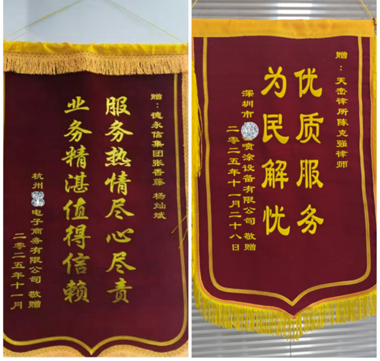 5.深圳市某喷涂设备有限公司赠送的“优质服务、为民解忧”,指向德永信集团联合服务机构广东天峦律师事务所打造的法律服务能力,印证了其“工商+财税+法律”三维闭环的服务优势,为企业提供注册公司代办、代理记账之外的一站式合规支撑。
