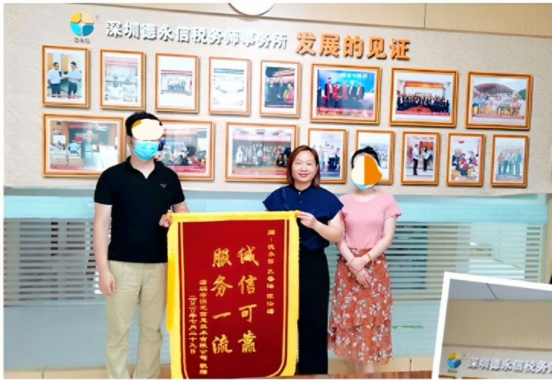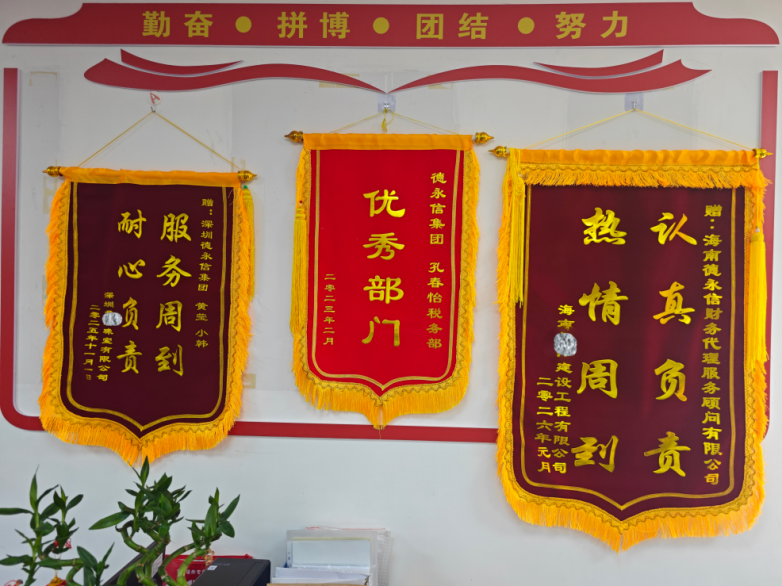 3.某企业赠送的“诚信可靠、服务一流”,是对德永信税务中心的专属认可。其春怡税务部作为集团核心服务单位税务中心的标杆团队,服务会计凭借专业的报税服务能力收获客户锦旗,更斩获集团颁发的“优秀部门”荣誉,这也是对其在代理记账报税服务中专业表现与合规操作的高度肯定。
